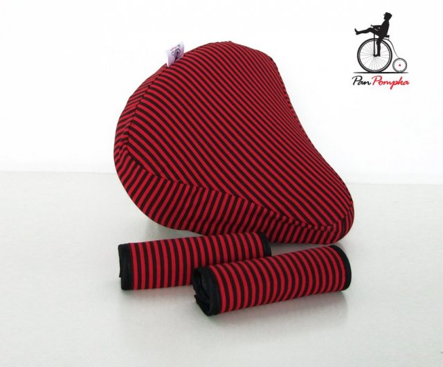 efektowny i praktyczny pokrowiec na siodełko wykonane z polskiej bawełny i ekoskóry ( do wyboru wierzch z bawełny czerwone czarne prążki lub z ekoskóry czerwonej bądz czarnej )