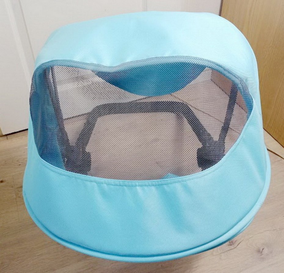 Budka, daszek do Bugaboo Donkey w kolorze błękitnym. Wykonana z tkaniny wodoodpornej. Podszewka również błękitna. Okienko z siatki w kolorze szarym.