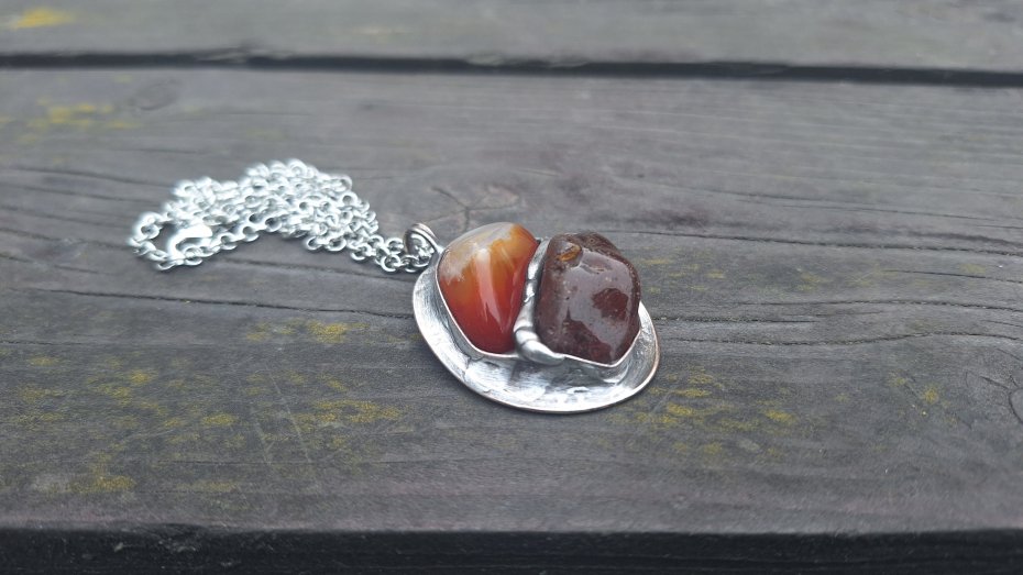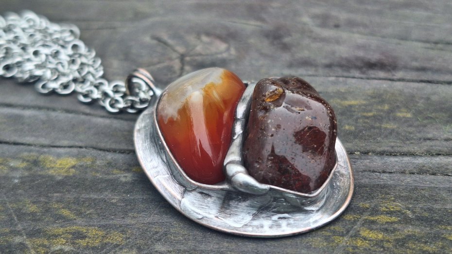 Wisiorek wykonany z miedzi, cyny, agatu i bursztynu. Wymiary ok. 4 na 3.5 cm. Zawieszony na łańcuszku o długości ok. 50 cm.