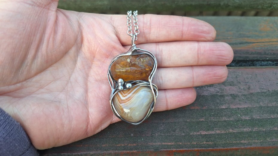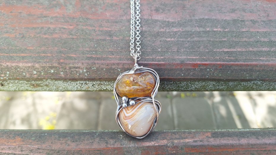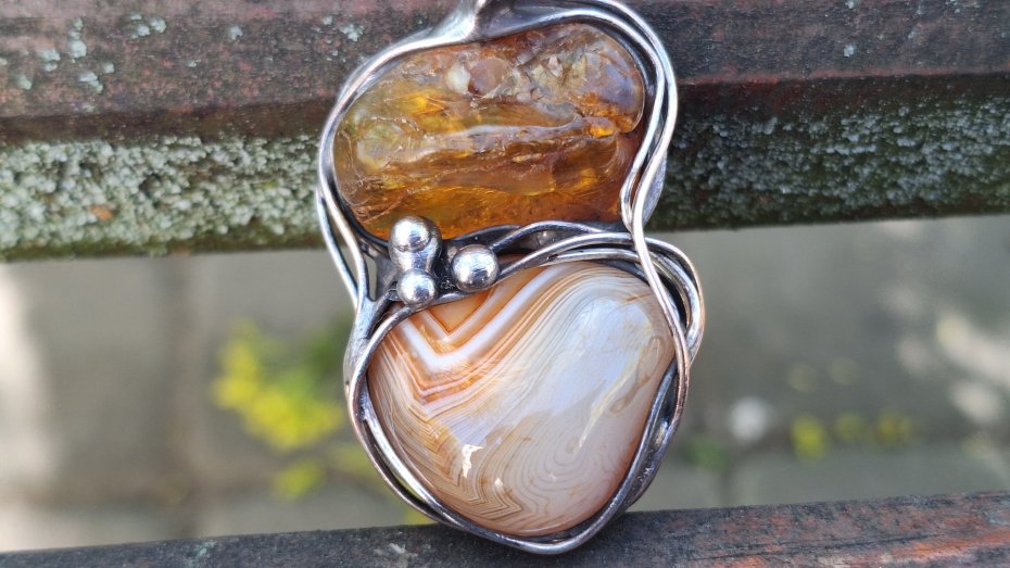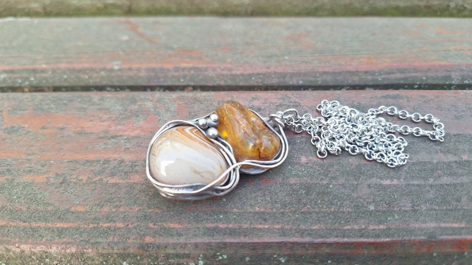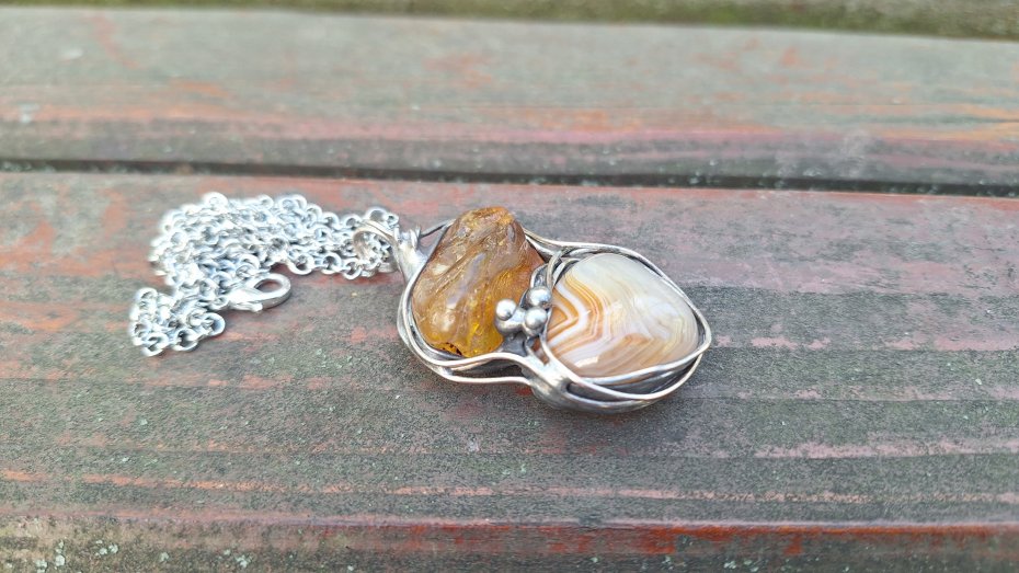 Wisiorek wykonany z miedzi, cyny, agatu i bursztynu. Wymiary ok. 5 na 3 cm. Zawieszony na łańcuszku o długości ok. 50 cm.