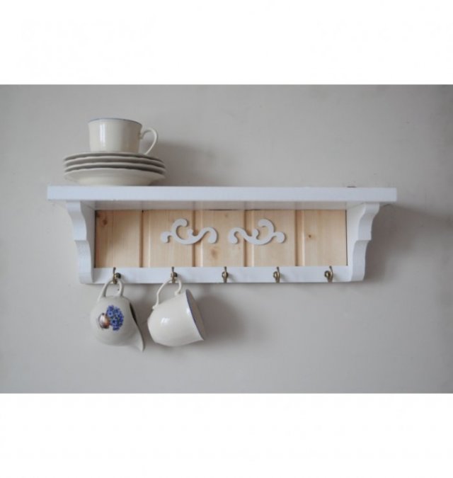 Półeczka została wykonana ręcznie z drewna sosnowego, pomalowana na biało farbą akrylową, tył półki jest w kolorze naturalnego drewna . Ozdobiona jest dekorami wyciętymi z drewnianej sklejki pomalowanymi na biało.
