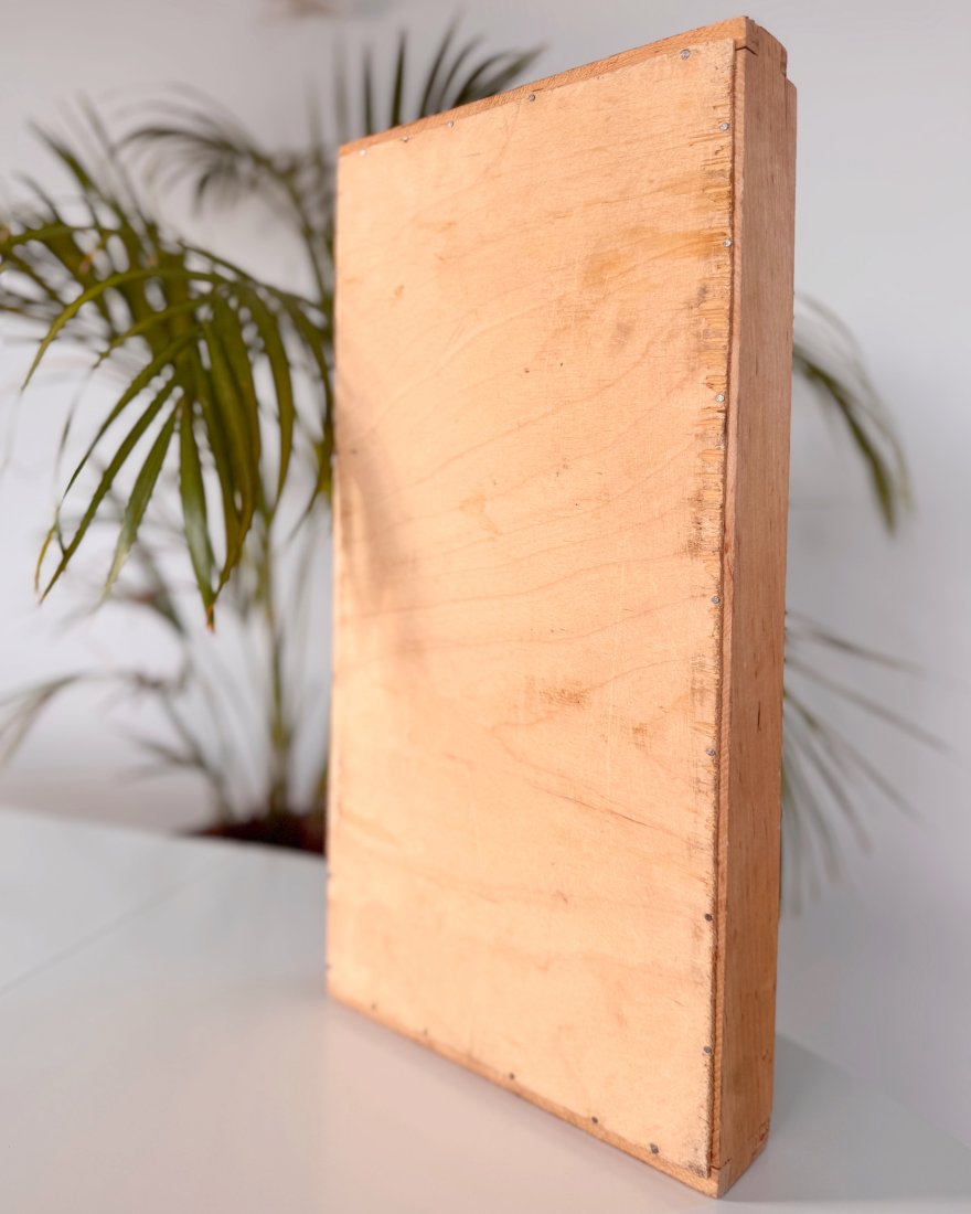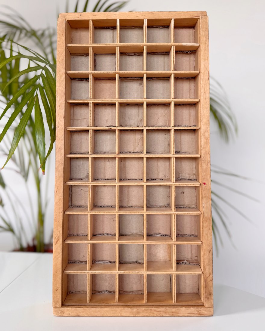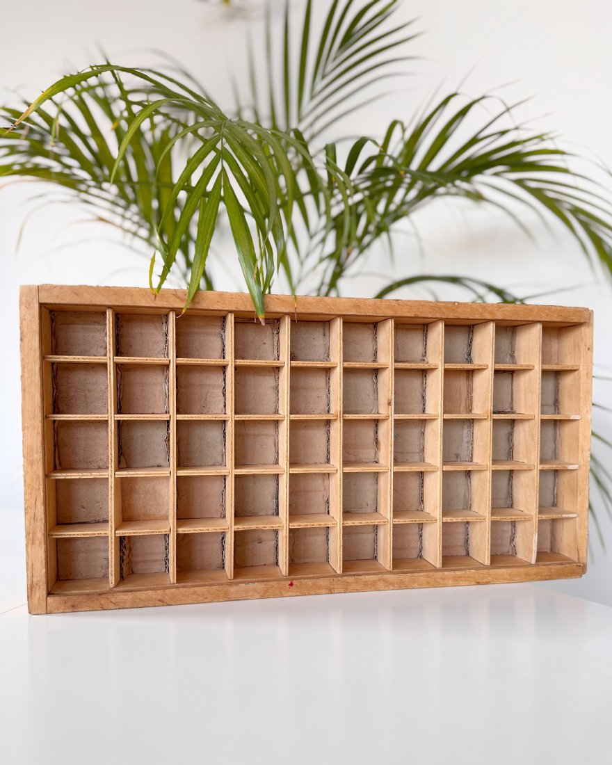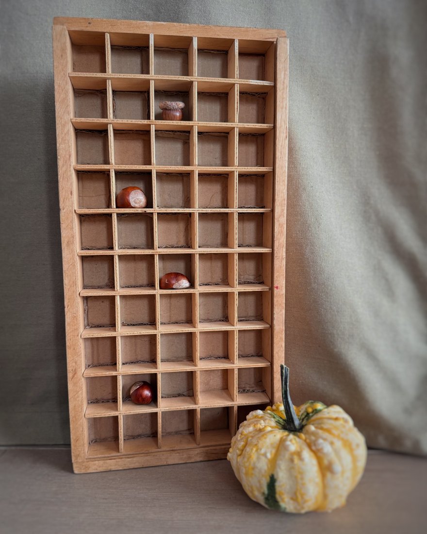 Półka drewniana typu gablotka / ekspozytor z przegródkami, idealna na drobne przedmioty kolekcjonerskie.