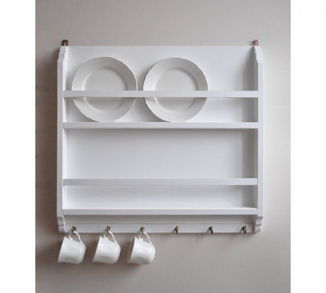 Półka została wykonana ręcznie z drewna sosnowego, pomalowana na biało farbą akrylową i przetarta na krawędziach.