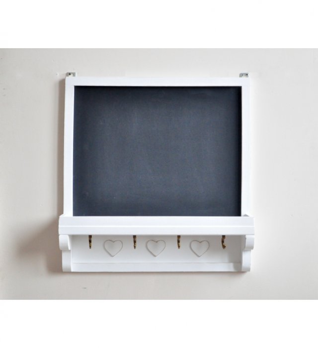 Pólka została wykonana ręcznie z drewna sosnowego, pomalowana na biało i przetarta na krawędziach. Tył półki pomalowany jest farbą tablicową.Ozdobiona jest białymi serduszkami wyciętymi z drewnianej sklejki.