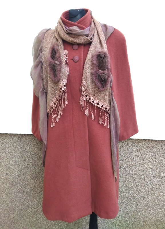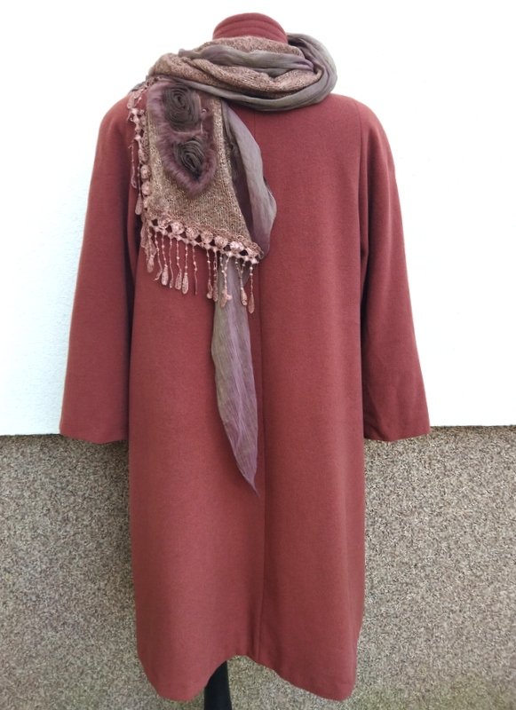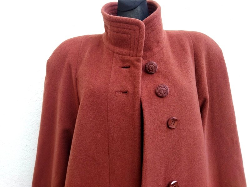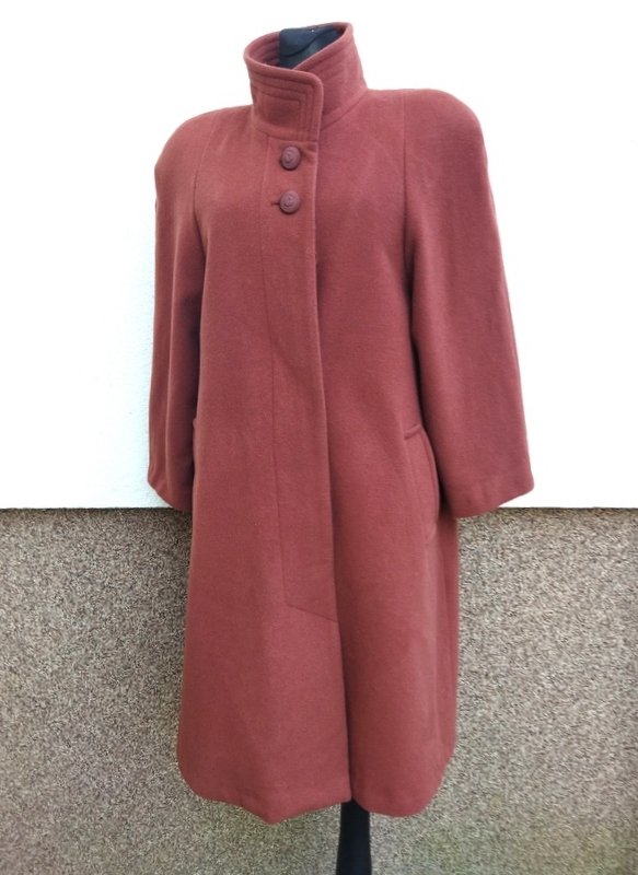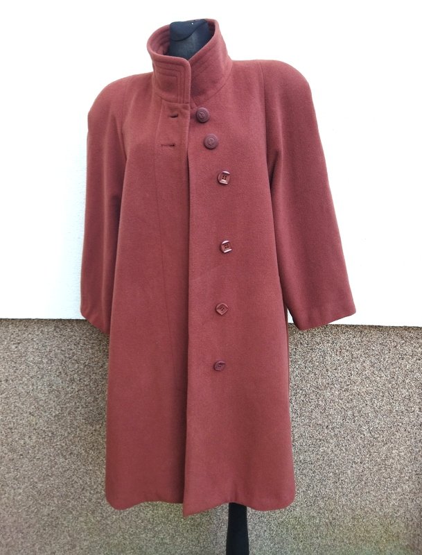 Świetnej jakości płaszcz z lodenowej najprawdopodobniej wełnianej tkaniny z kaszmirem i nylonem w kolorze zbliżonym do mahoniowego odcienia brązu. Trapezowy fason z wysoką stójką , z raglanowymi rękawami 3/4, z dwiema wpuszczanymi kieszeniami. zapinany od zewnątrz na dwa ozdobne guziki od góry , dalej od wewnątrz na guziki schowane pod plisą. Całość na eleganckiej podszewce.