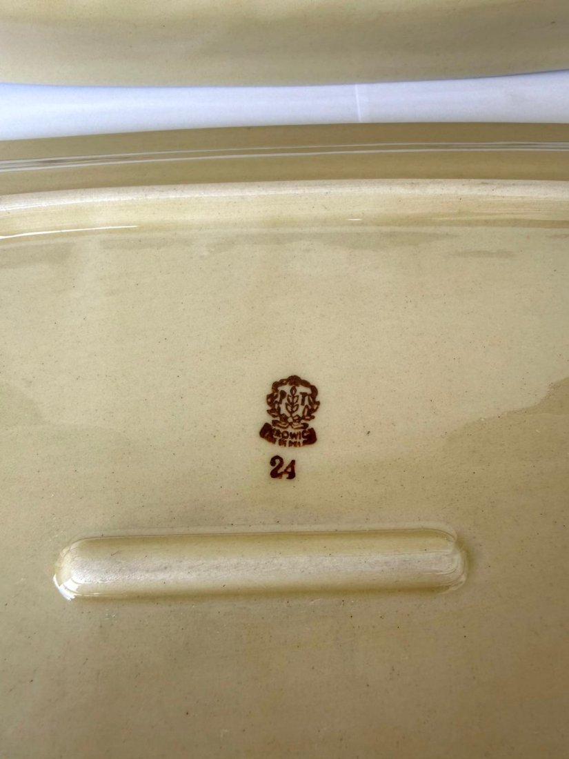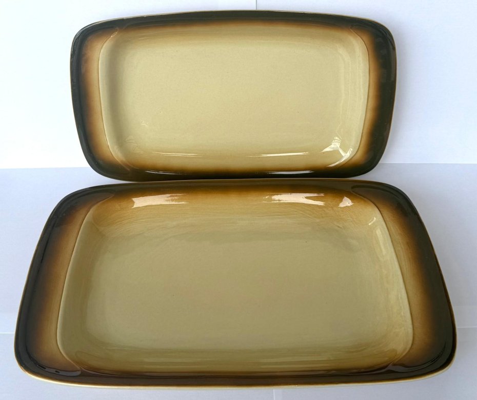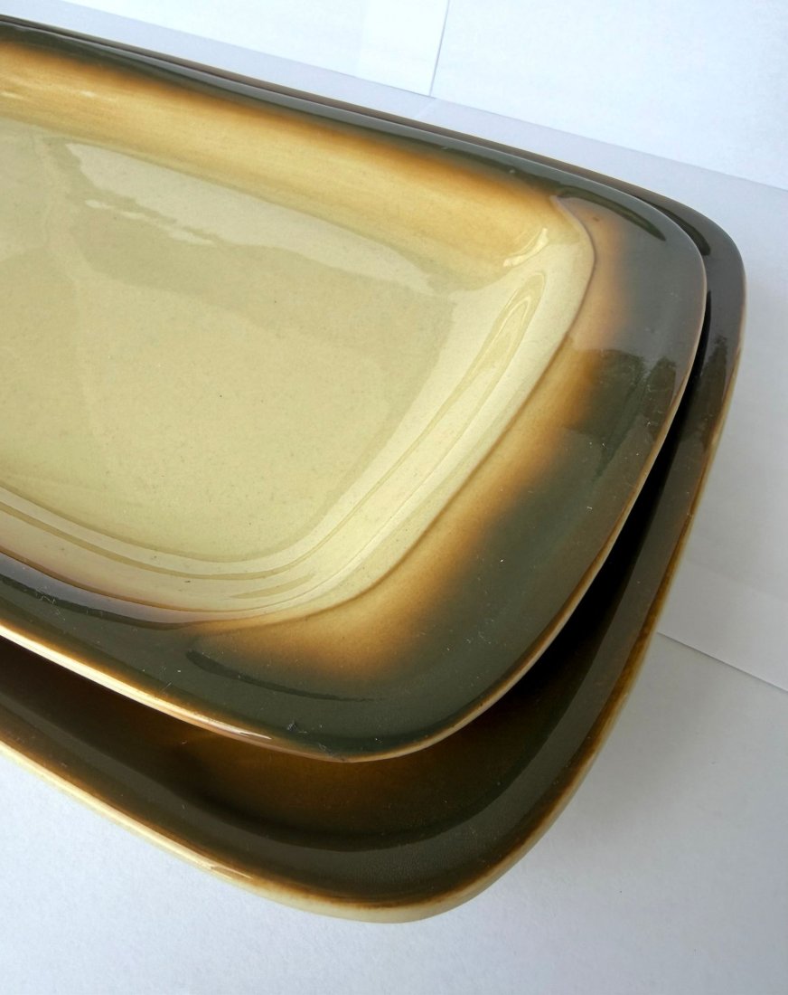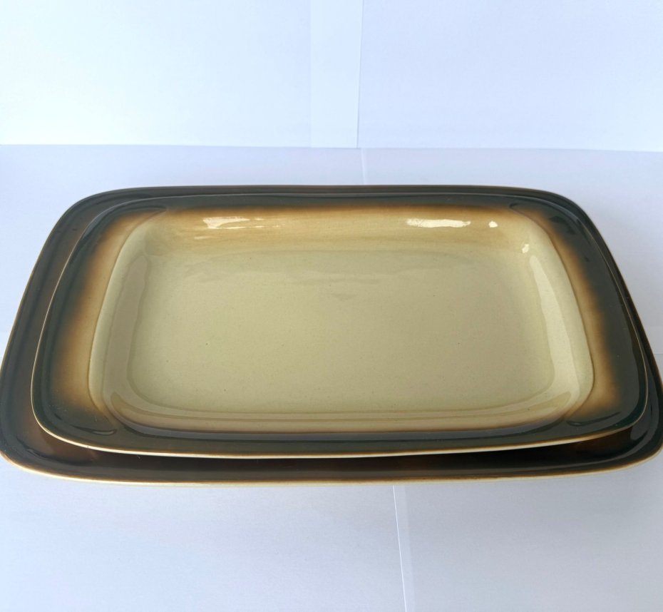 Komplet dwóch sygnowanych półmisków z Tułowic – jeden większy, drugi mniejszy. To elegancka ceramika z lata 60–80 XX wieku, ceniona dziś za swój ponadczasowy styl i wysoką jakość wykonania. Charakterystyczne cieniowanie brązu przy rantach idealnie wpisuje się w estetykę vintage, retro oraz modern home.