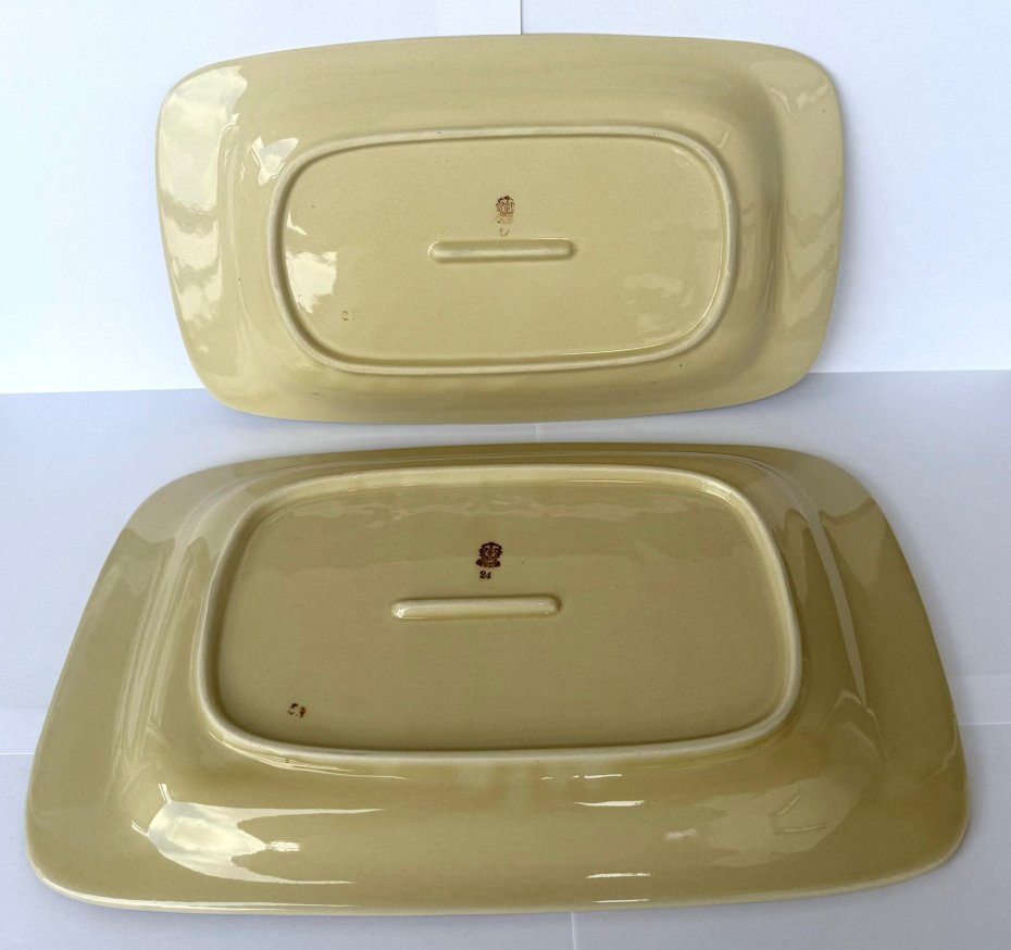 Oba półmiski są w bardzo dobrym stanie – bez pęknięć i wyszczerbień. Doskonale sprawdzą się zarówno w codziennym użytkowaniu, jak i jako dekoracyjny akcent w kuchni lub jadalni.