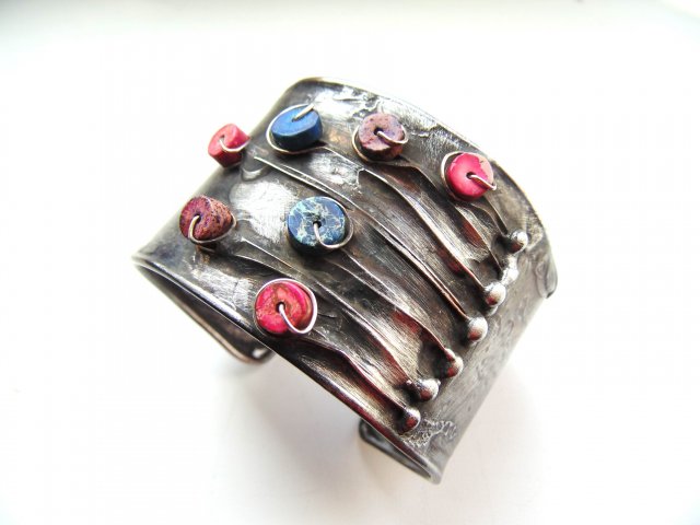 Bransoletka wykonana z miedzi, cyny i jaspisów. Szerokość ok. 4 cm. Obwód regulowany.