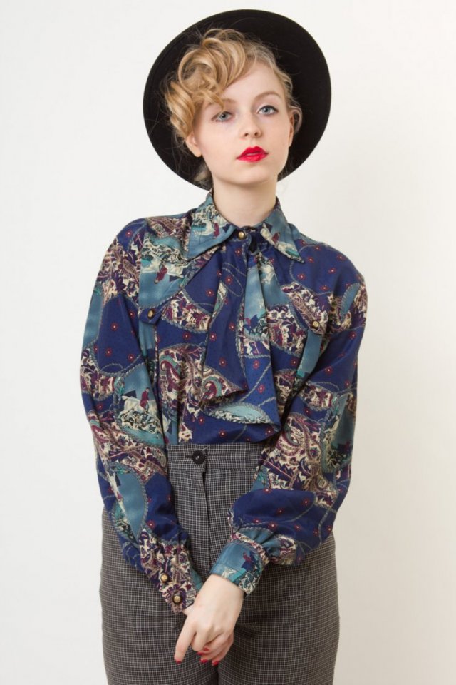 Koszula vintage z kołnierzykiem, zapinana na guziki, ciekawy fason - z przodu ozdobny żabot. Koszula z wcięciem w talii, fajnie wymodelowana. Ciekawe printy.