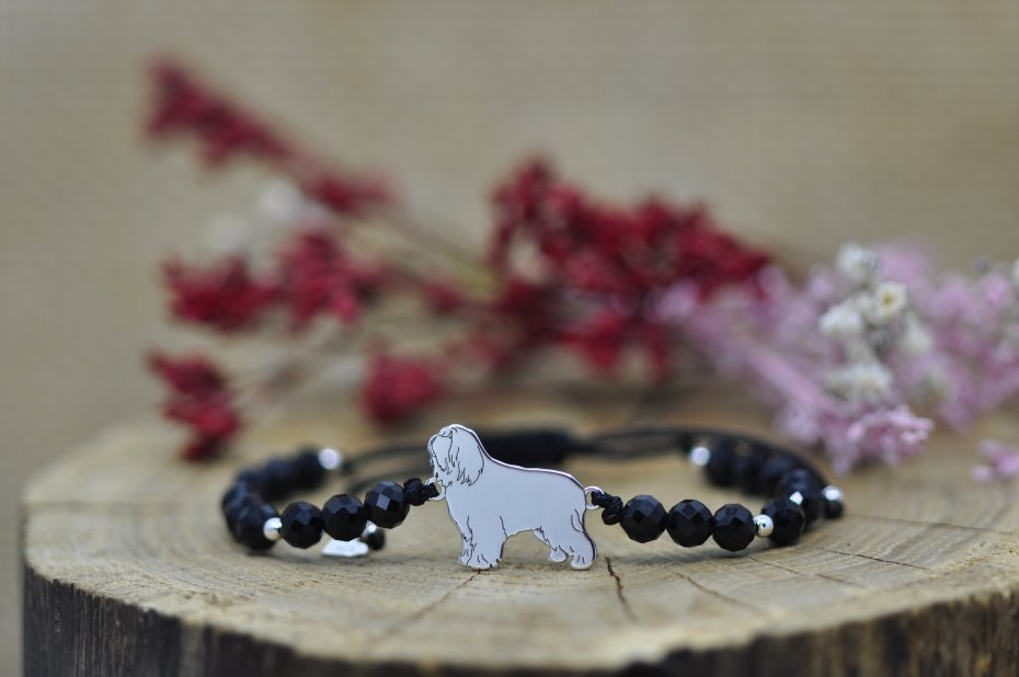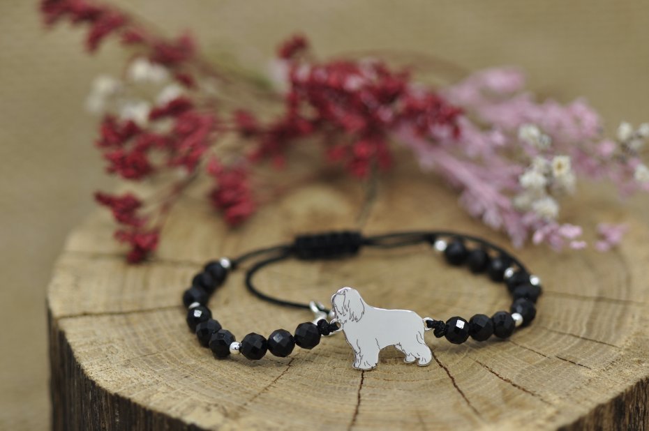 Polski Owczarek ze srebrnej blachy próby 925, wymiary pieska: 19,7 x 15,5 mm, grubość 0,8 mm oraz srebrne kulki.