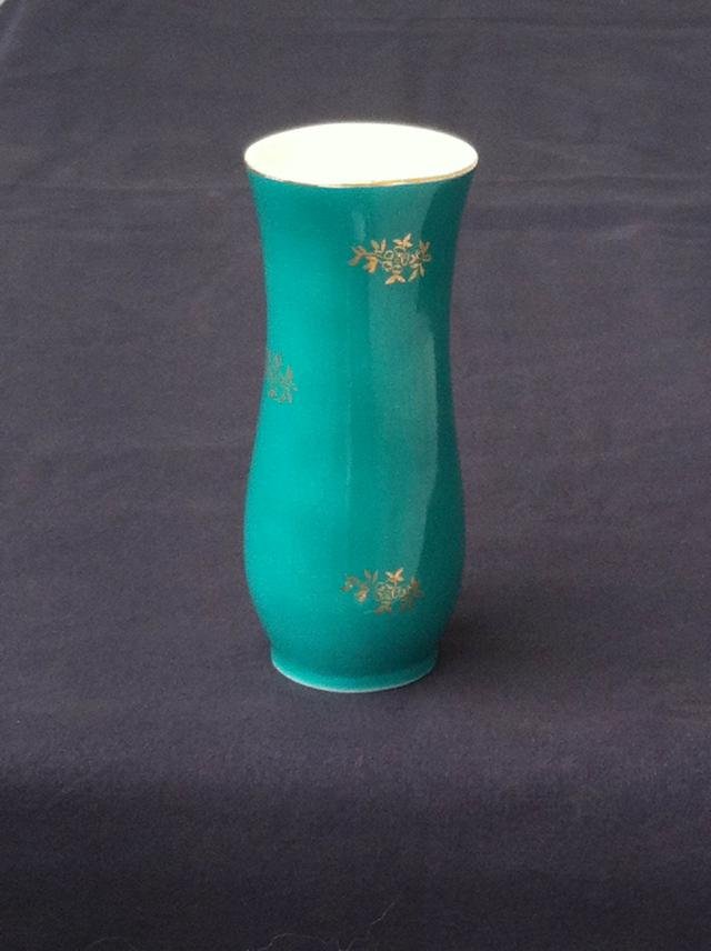 Porcelitowy wazon - oryginał polskiego wzornictwa z lat 60-tych. Piękny kolor i złocony nadruk kwiatowy. Sygnowany Chodzież, także numerycznie. Średnica 6; wysokość 14 cm. Stan zachowania dobry.
