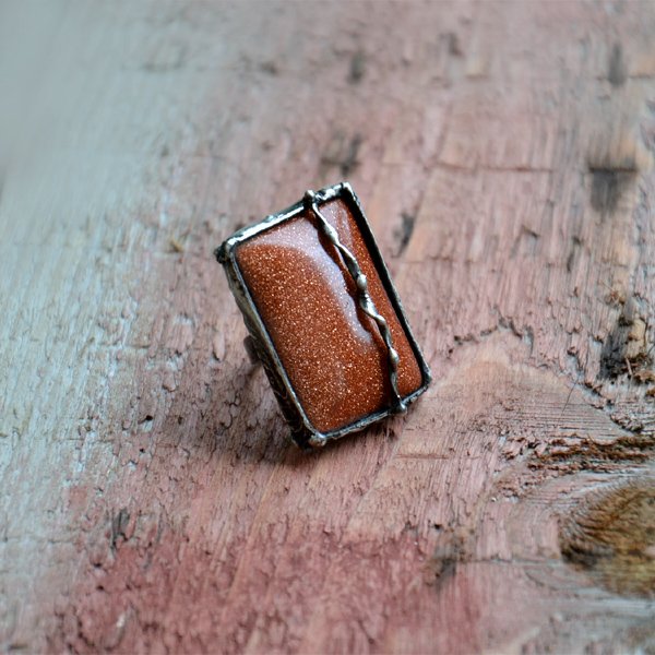 Przedstawiam duży, retro pierścień z piaskiem pustyni. Wymiary kamienia wraz ze stylizowaną na stare srebro oprawą wykonana z ekologicznej cyny to ok. 3,3 x 2,3 cm. Obrączka regulowana. Biżuteria w 100% wykonana ręcznie, poszczególne sztuki mogą się minimalnie różnić.