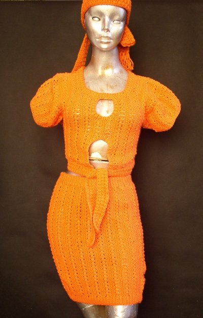 Pomarańczowy komplet dwuczęściowy.Włóczka,zrobiony samodzielnie na drutach.Spódnica ścieg ozdobny,góra wykończona podwójnym ściągaczem.Dół ściągaczem 3 cm.Długość 49 cm.pas 68 cm.max.72 cm.Góra krótka,doszyte małe rękawki.Z przodu dwie łezki okrągłe,dolna z wiązaniem.Długość 42 cm.pod pachami 88 cm.Dodatkowo pasek zakończony frędzlami trochę w innym odcieniu pomarańczowego.Stan bardzo dobry,brak śladów używania.