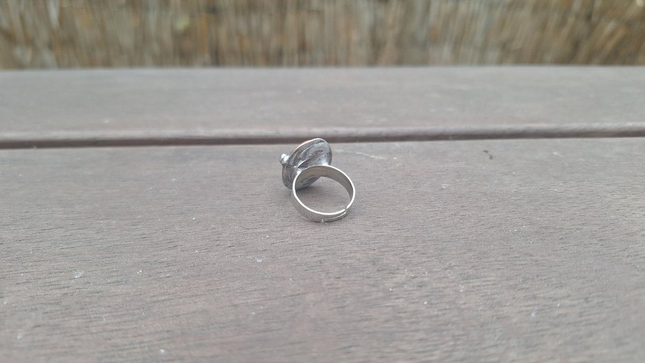 Pierścionek wykonany z miedzi, cyny i jadeitu. Wymiary ok. 2 na 1.5 cm. Regulowany. Nie jest ciężki.