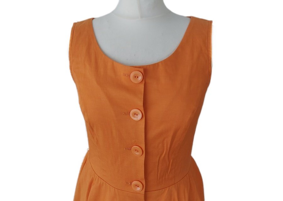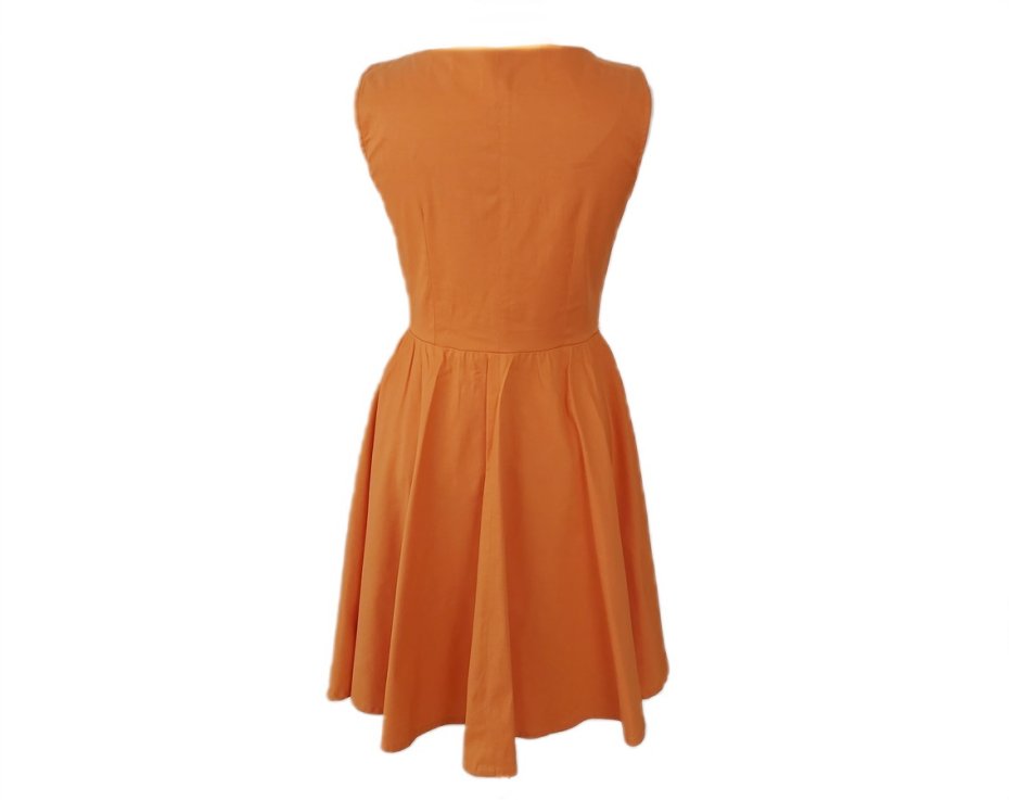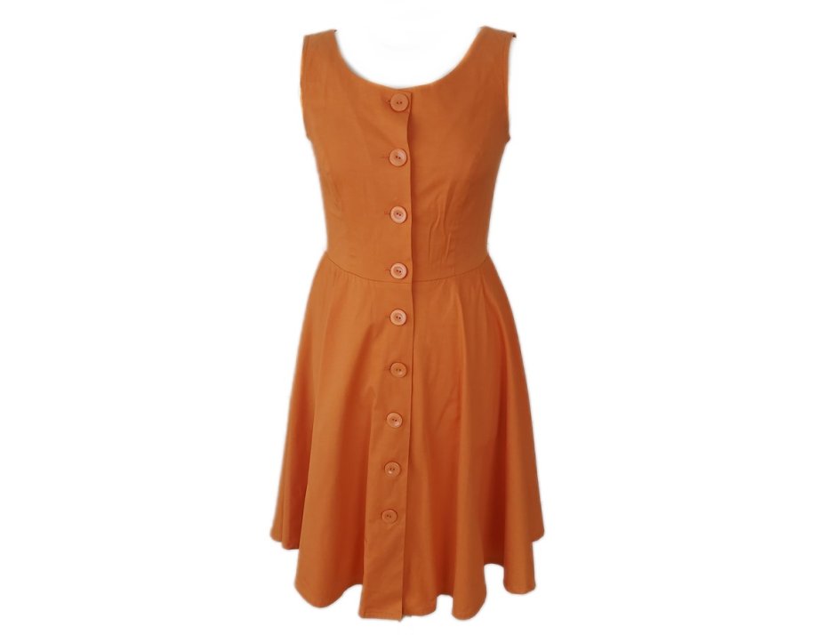 Bardzo kobiecy fason sukienki: dopasowana góra, odcięcie w talii, rozkloszowany dół. Całość na guziki.