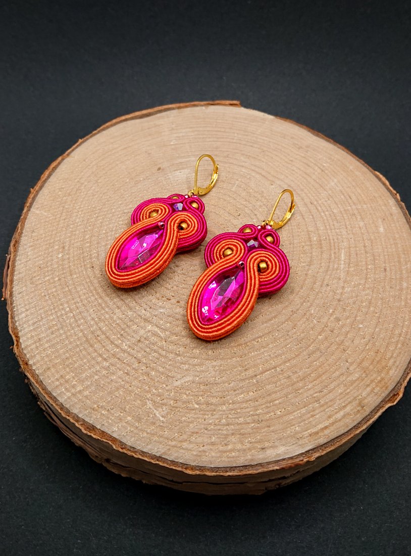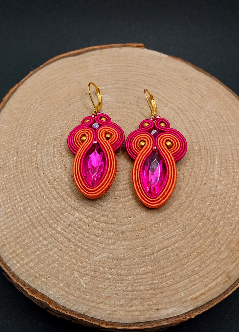 Szklane fasetowane kryształki w kolorze intensywnego rożu otoczone ciemnopomarańczowymi sznurkami sutasz oraz szklanymi koralikami w odcieniu starego złota. Góra kolczyków w odcieniu fuksji z różowymi kryształkami. kolczyki zawieszone na metalowych biglach angielskich w kolorze złotym.