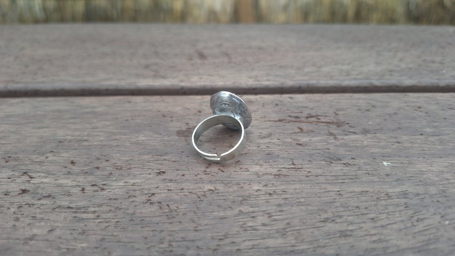 Pierścionek wykonany z miedzi, cyny i jadeitu. Wymiary ok. 2 na 1.5 cm. Regulowany. Nie jest ciężki.