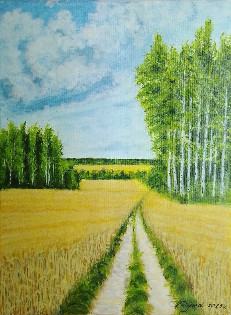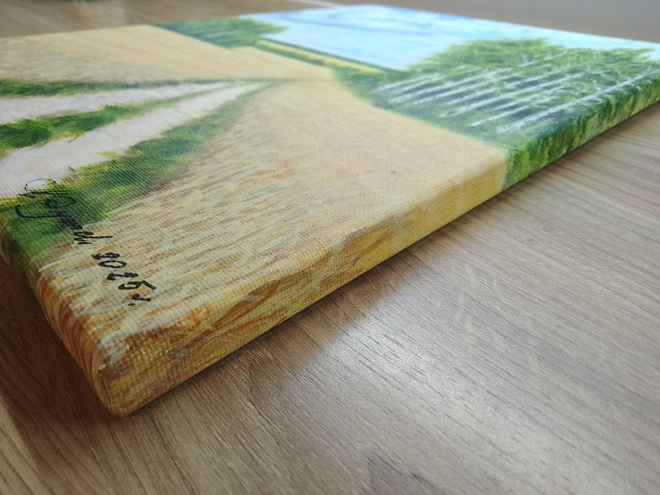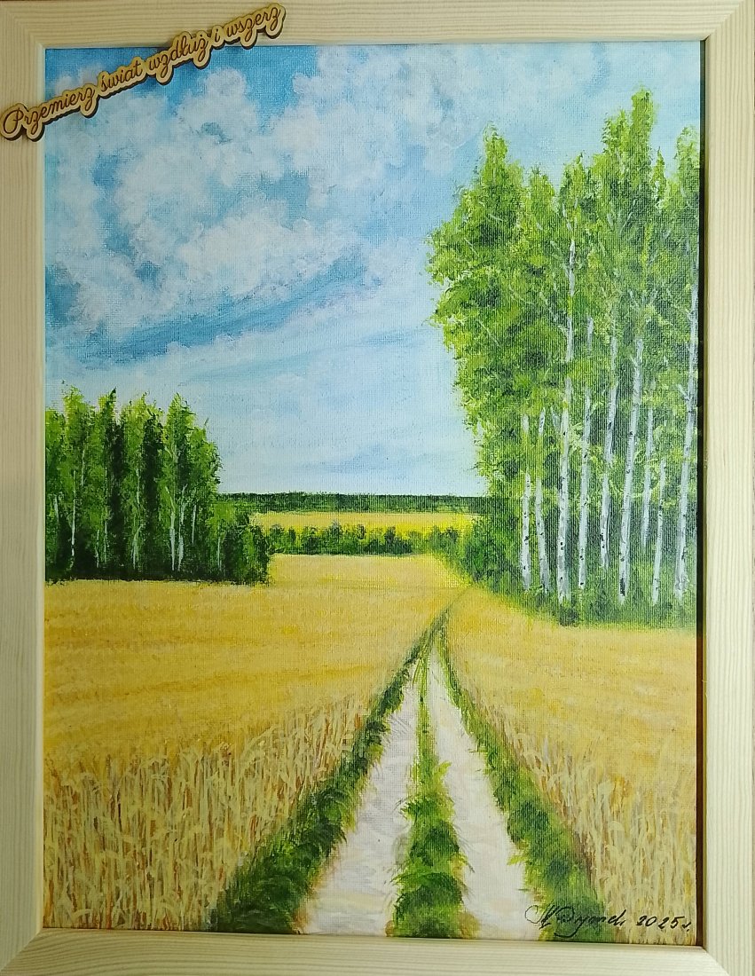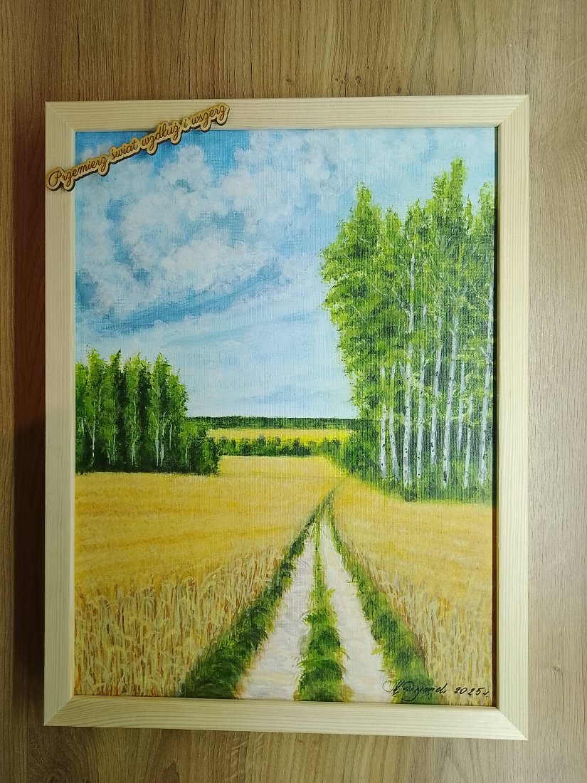 - Tematyka: Pejzaż sielski, złote pola zbóż, lasek brzóz