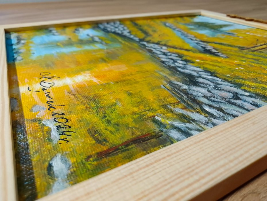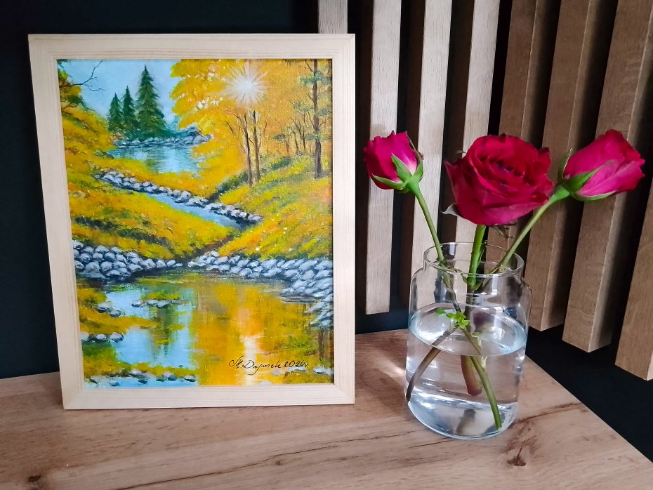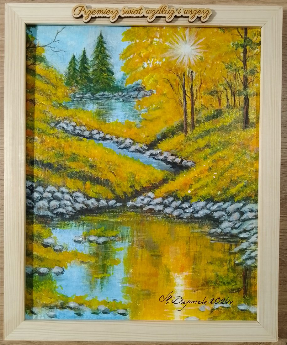- Tematyka: Pejzaż przedstawiający urokliwy, jesienny potok skąpany w słońcu
