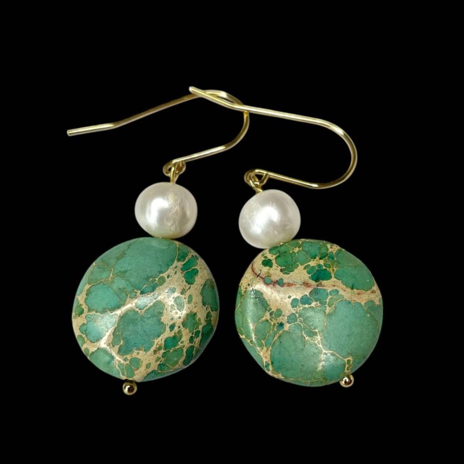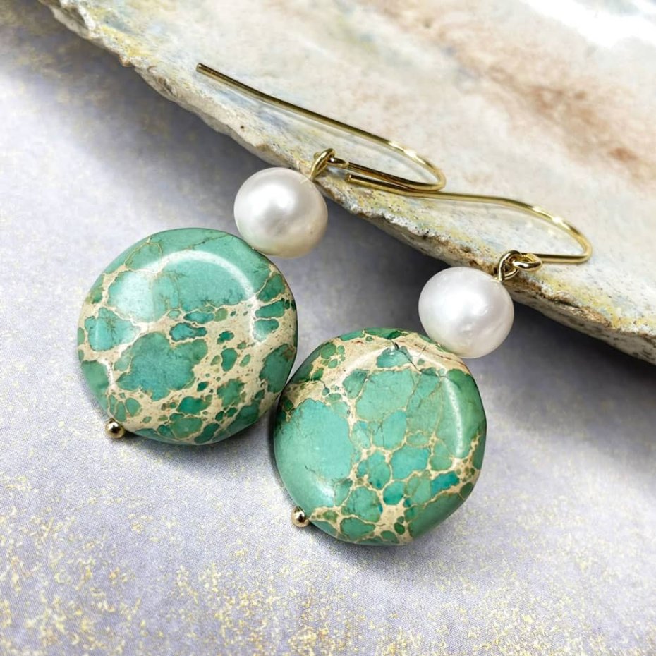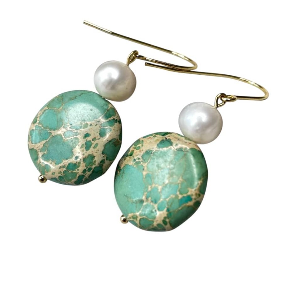 Kolczyki z jaspisem i perłą to harmonijne zestawienie naturalnych materiałów i subtelnego połysku. Na biglach umieszczono jaspis cesarski o pastelowej barwie, a tuż nad nim połyskuje drobna, elegancka perła. Połączenie różniących się faktur i tonów nadaje całości szlachetności oraz delikatnego charakteru. To uniwersalna biżuteria, która sprawdzi się zarówno w codziennych zestawieniach, jak i przy bardziej uroczystych okazjach, dodając stylizacji ponadczasowego wdzięku.