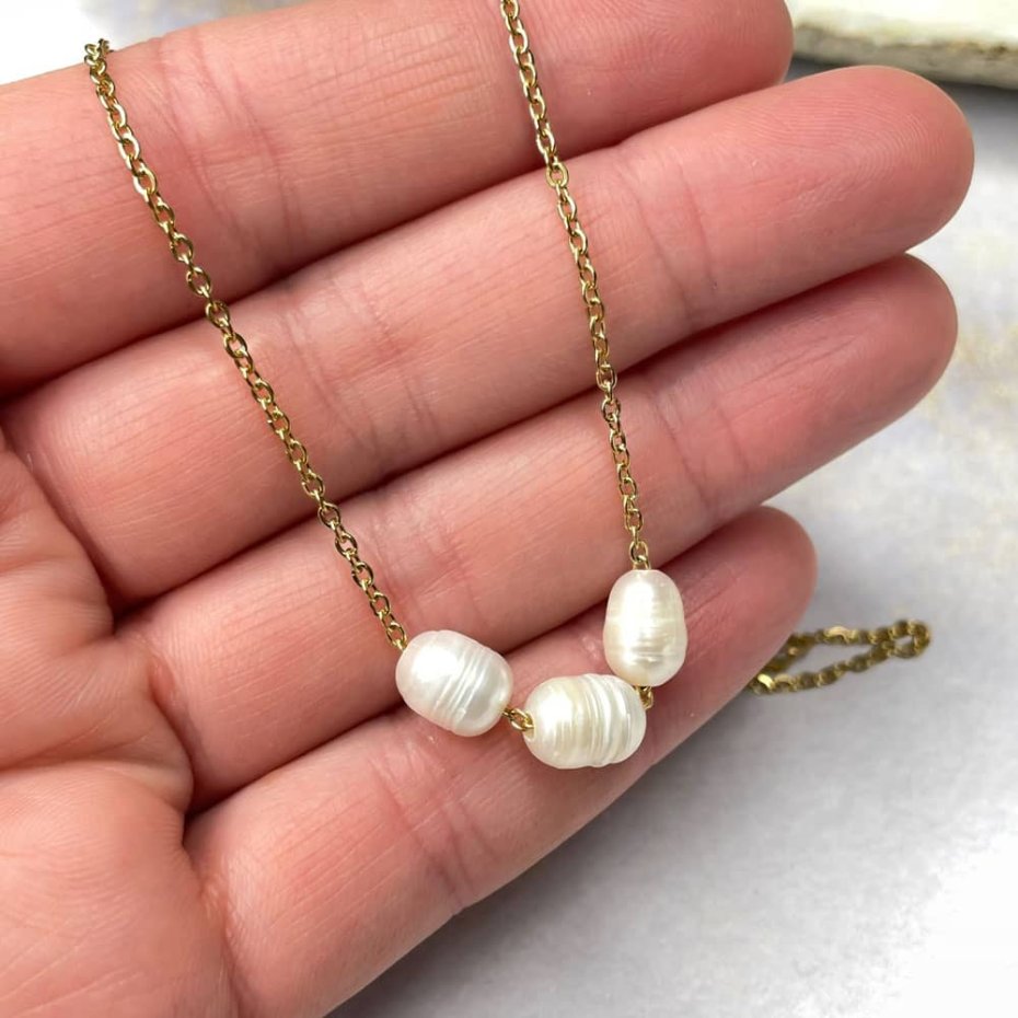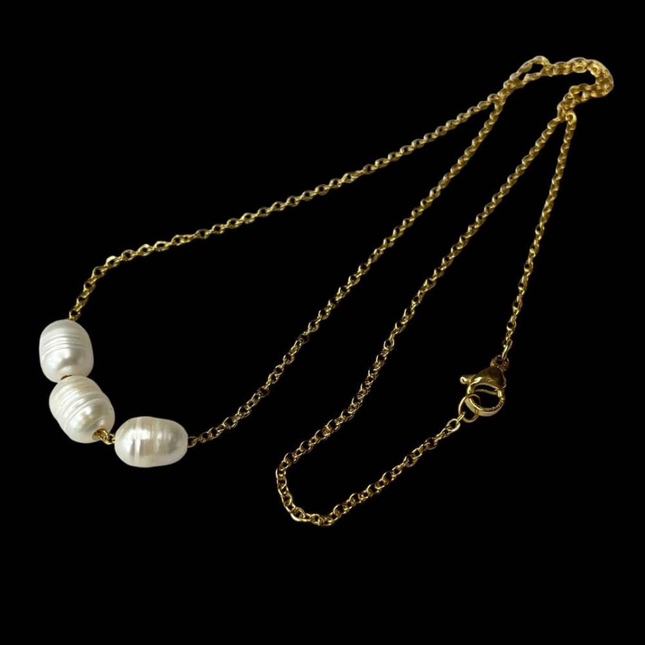 Ten delikatny naszyjnik z trzema naturalnymi perłami to klasyka przedstawiona we współczesnej formie. Każda z pereł wyróżnia się swoim indywidualnym kształtem, co nadaje całej kompozycji organiczny charakter oraz szlachetną, niewymuszoną elegancję. Złocony łańcuszek subtelnie podkreśla ich blask i sprawia, że całość prezentuje się wyjątkowo dyskretnie i elegancko.