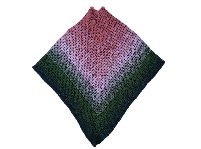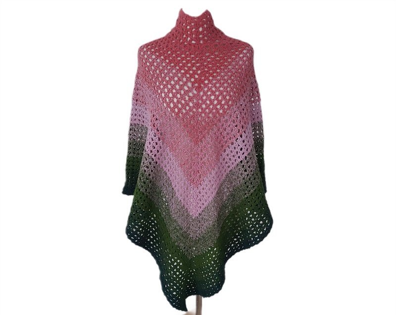 Poncho ze stójką – unikalny, ręcznie wykonany egzemplarz, w którym połączono odcienie zieleni i różu, tworząc efekt ombre. Płynne przejścia kolorystyczne nadają mu wyjątkowego charakteru. Poncho jest dość długie, dzięki czemu doskonale sprawdzi się jako wyrazisty akcent w codziennych stylizacjach.