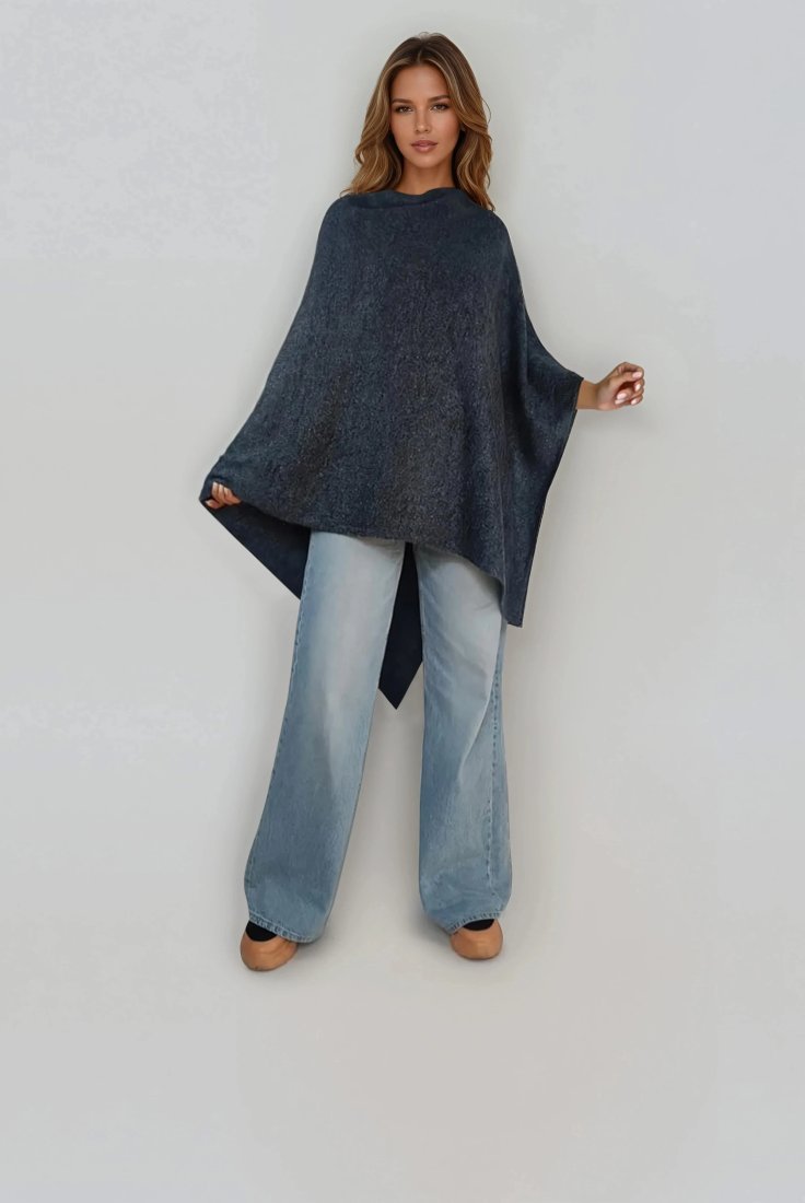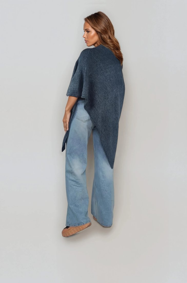 To piękne dzianinowe ponczo to niezbędny dodatek w Twojej szafie ze względu na swoją prostotę, elegancję i wszechstronność. Ponczo w kolorze jeans melanż wykonane jest z bardzo miękkiej i przyjemnej dzianiny dzięki czemu idealnie dopasowuje się do sylwetki.