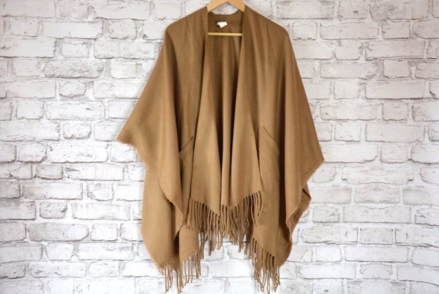 Jasno brązowe ponczo o asymetrycznym kroju, z przodu po bokach kieszonki, wykończone frędzlami .(Sprzedawane bez dodatków).