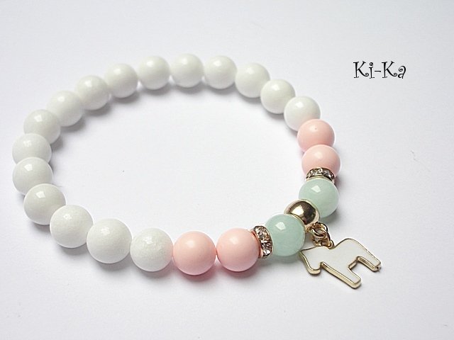 Bransoletka wykonana z naturalnych kamieni - jadeity [8mm], muszli [8mm], przekładek wysadzanych kryształkami oraz elementów w kolorze tzw. różowego złota. Bransoletka na gumce silikonowej. Pasuje na nadgarstek 14,5-15,5cm. Biżuteria ozdobnie zapakowana. Możliwość dopasowania bransoletki do nadgarstka - wcześniej prosimy o kontakt. W ofercie inne kolory - zdjęcia.