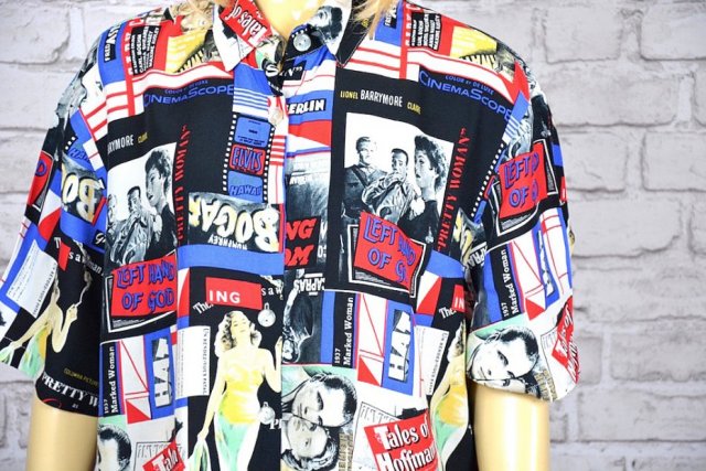 Unikatowa, dłuższa koszula/ bluzka koszulowa pop art w filmowe nadruki, kadry z filmów, postacie z światowego kina, zapinana na guziczki, pod szyją kołnierzyk.