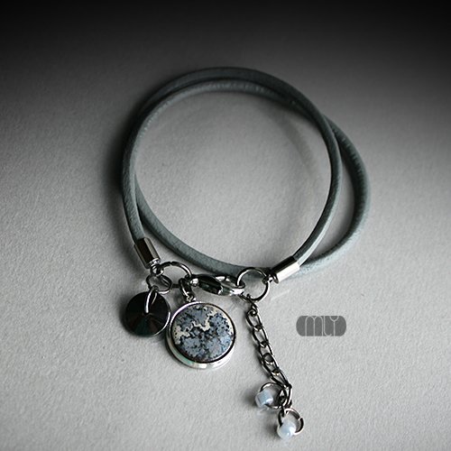 Efektowna bransoletka wykonana z rzemienia jubilerskiego, elementów w kolorze starego srebra i ręcznie wykonanej ceramicznej zawieszki, szkliwionej mieszanką szarych szkliw z efektem plamek o subtelnym połysku, Obwód regulowany. Polecam