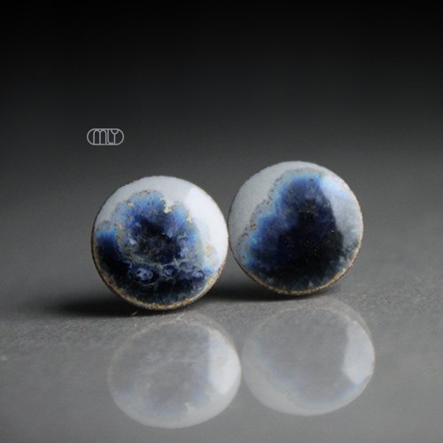 Ceramiczne okrągłe kolczyki w formie sztyftów, ręcznie wykonane z delikatnej gliny kamionkowej, jednostronnie szkliwione mieszanką szarych szkliw z efektem plamek i pięknym połyskiem, na antyalergicznych sztyftach w kolorze srebrnym. Średnica ok. 11mm. Polecam