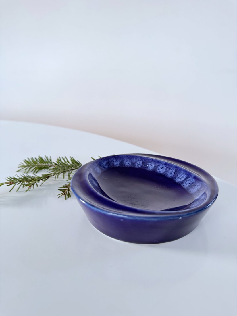 Popielnica Oko, szkliwiona na kolor kobaltowy, wokół rantu charakterystyczne zdobienie.