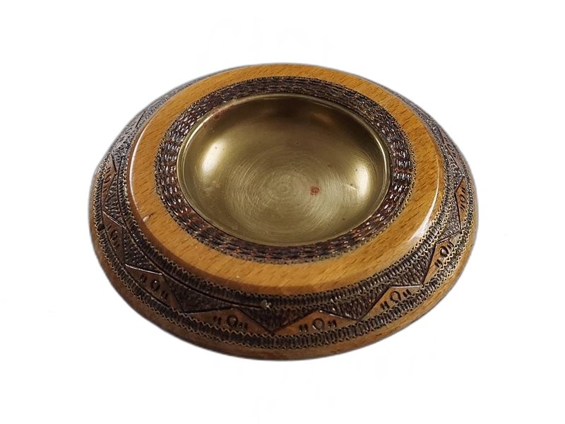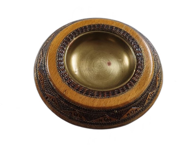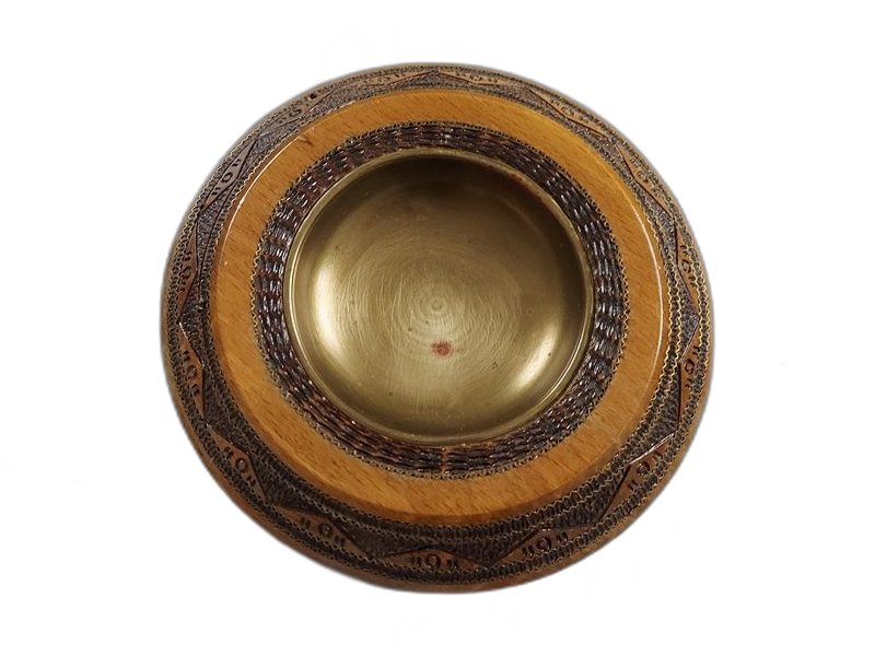 Drewniana popielniczka - żłobione drewno z metalowym wkładem. Możesz jej użyć jako podkładkę pod tealight.