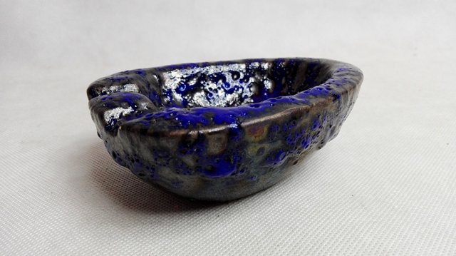 Oryginalna popielniczka vintage [ lata 60/70-te]- ceramika w stylu FLAT LAVA. Chropowata, strukturalna powierzchnia, głęboki, nasycony[ kobaltowy ] kolor. Dwa wgłębienia na brzegu na papierosa.