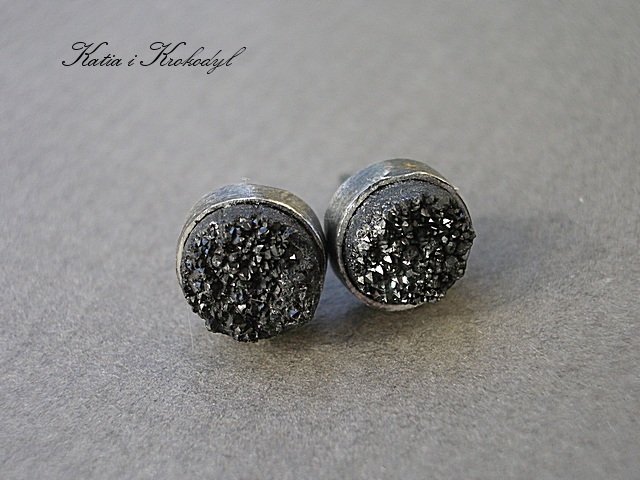 Kolczyki sztyfty wykonane własnoręcznie od podstaw ze srebra [pr.925 i 999] w połączeniu z druzami agatów pokrytych tytanem w kolorze grafitowym [śr,8-9mm]. Kamyczki pod wpływem padania światła skrzą się jak diamenciki -zdjęcia nie oddają ich uroku. .Srebro oksydowane i przetarte. Biżuteria ozdobnie zapakowana