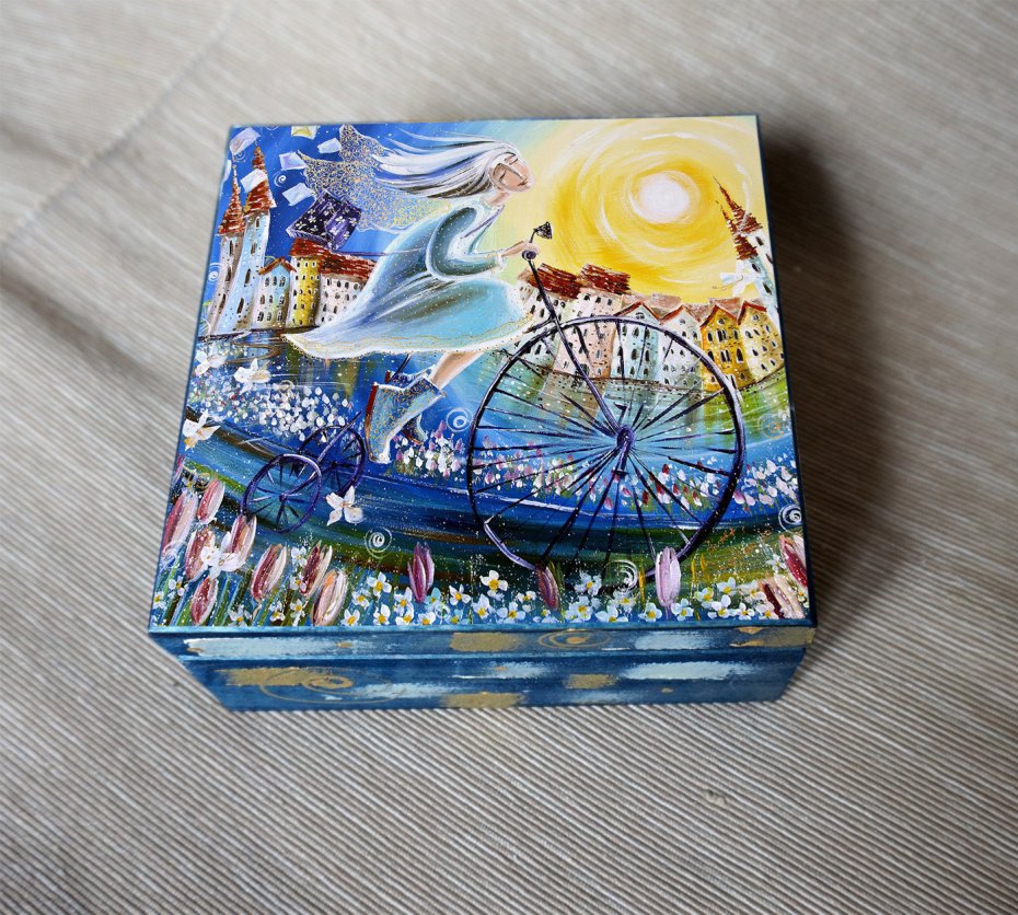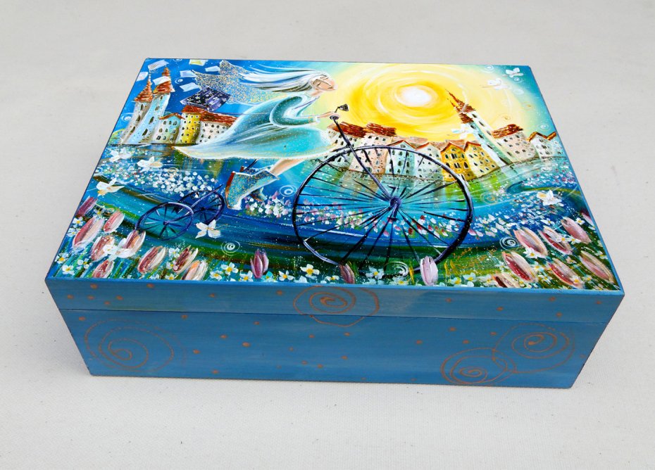 Podłużna, drewniana szkatułka, wykonana techniką decoupage. Na jej wierzchniej części umieszczona została reprodukcja obrazu autorskiego, zatytułowanego "Poranek na dobre wiadomości", natomiast boki szkatułki zdobione są ręcznie przy użyciu farby akrylowej. Całość zabezpieczona jest bezbarwnym lakierem z połyskiem oraz sygnowana w środku.