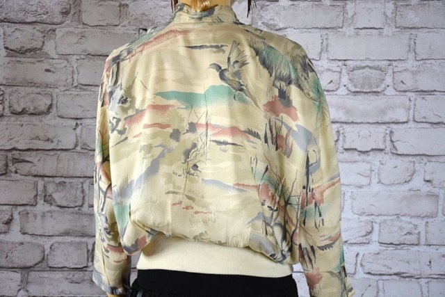 Przepiękna, klimatyczna bluzka o fasonie bomberka w jasnych pastelowych barwach , print przedstawia odlatujące ptaki prawdopodobniem o wschodzie słońca wczesnym rankiem , bluzka ma luźniejszy krój, jest zapinana na guzikczi- pod szyją delikatna stójka, wykończona ściągaczem.Bardzo efektowna.