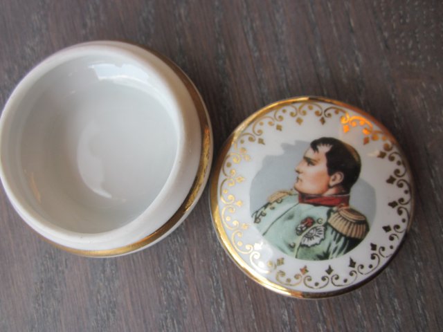 Miniaturowe puzderko. Kolekcjonerskie cacuszko z podobizną i podpisem Napoleona Bonaparte. Porcelana mocna, pod światło prześwitująca. Puzderko sygnowane - PORCELAINE DE LUXE FRANCE, oraz bodaj CORSE. ..niestety nie jestem pewna. Podstawa ze zlotym paskiem, przykrywka z podobizną Napoleona i ozdobnymi złocenianiami .Od spodu podpis. Przykrywka z rantem zabezpieczającym przed spadaniem. Wykończenie satynowo - błyszczące i satynowe. Użytkowe, kolekcjonerskie, eleganckie, niespotykane. Nadaje się na oryginalny prezent;) Pękatość 4,5 dół trochę ponad 3 góra podstawy trochę mniej niż 4, średnica przykrywki 4 cm wysokość z przykrywką 2,5, bez przykrywki nieco więcej niż 1,5 cm Stan zachowania bardzo dobry.