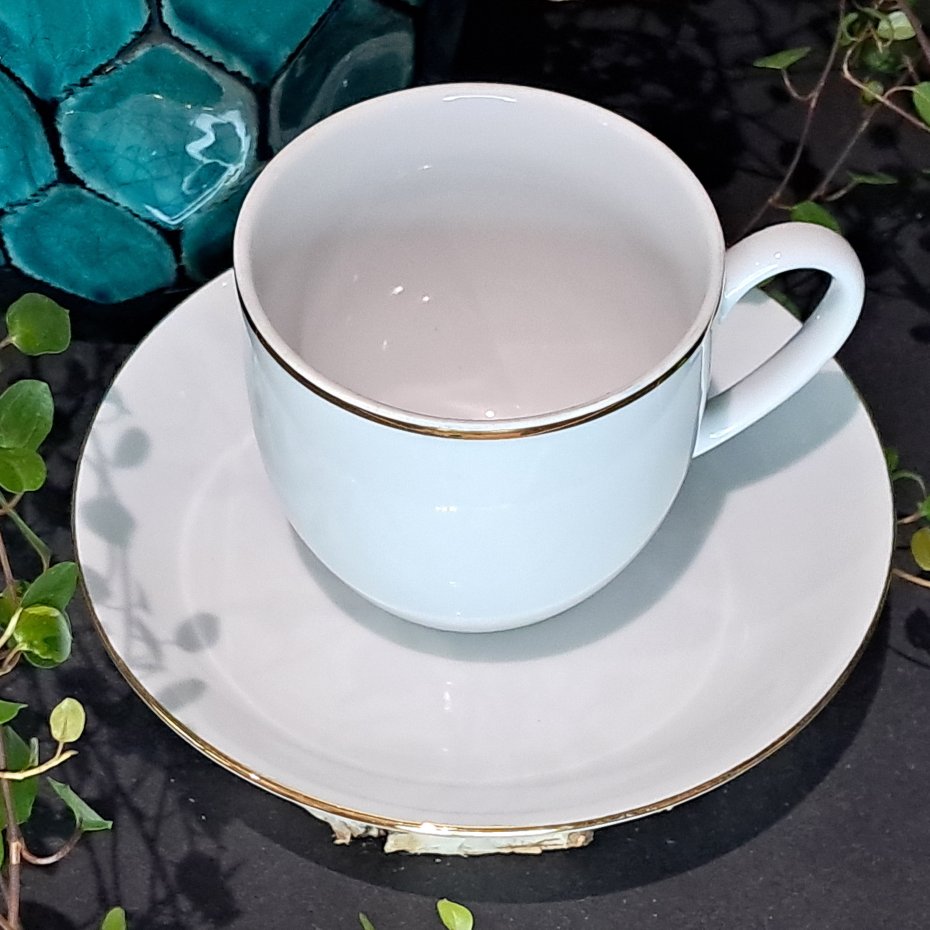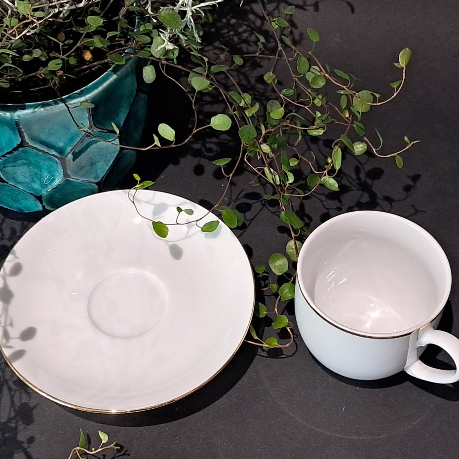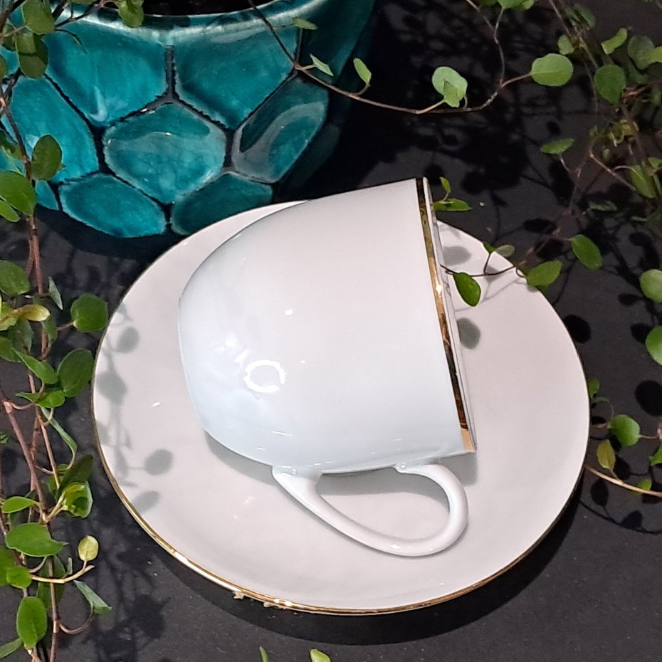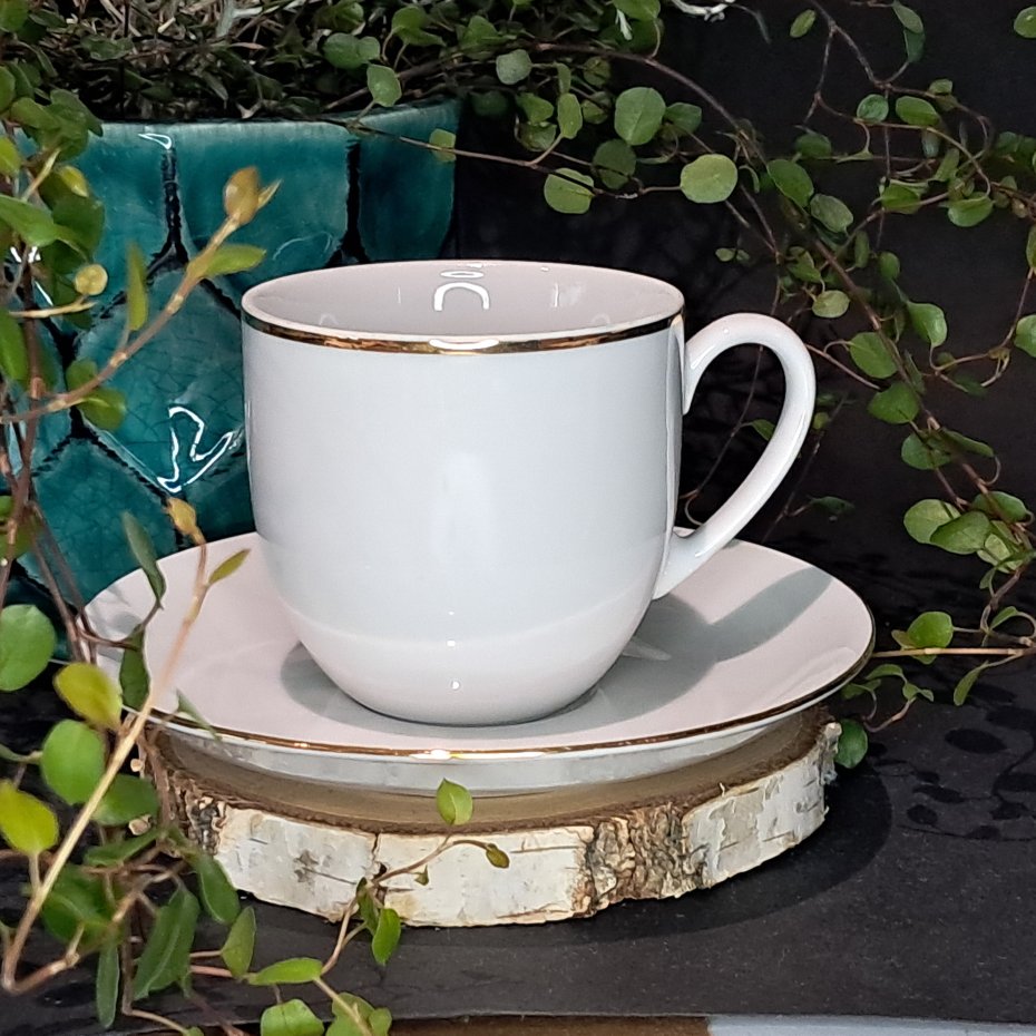 Porcelanowa filiżanka i spodek tworzą legancki zestaw o klasycznym charakterze. Wykonana ze śnieżnobiałej porcelany, zachwyca swoją czystością barwy i delikatnym połyskiem. Brzeg filiżanki oraz rant spodka ozdobione są subtelnym, lśniącym złoceniem, które dodaje całości wyrafinowanego szyku.