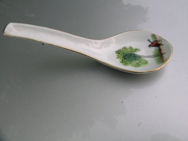 Orientalna porcelanowa łyżeczka - ręcznie malowana, złocona. Dekoracyjna i użytkowa. Nie sygnowana. Z wierzchu porcelana biała z ręcznym malunkiem,błyszczące szkliwienie.Delikatnie złocony rant.. 14 x 5 x 5,5 cm. Stan zachowania bdb - minus delikatne przetarcia złota na rancie.