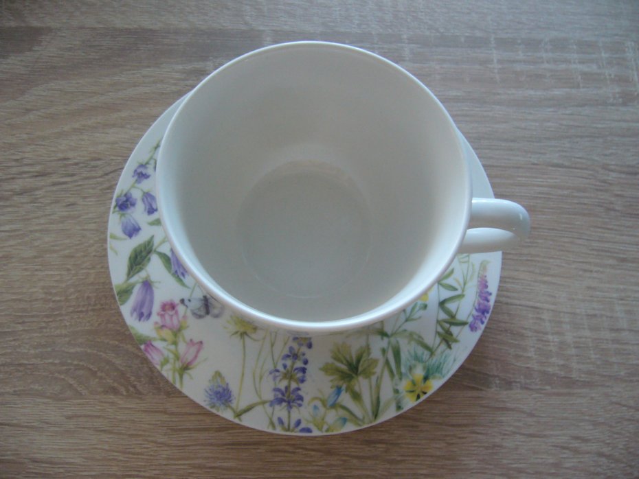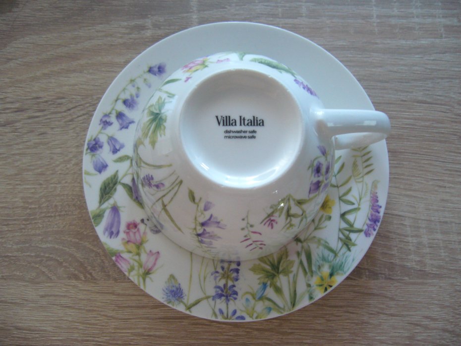 Porcelanowa filiżanka z talerzykiem z motywem kwiatowym.Średnica talerzyka 15,5 cm , filiżanka średnica 10 cm , podstawa 5 cm ,wysokość 6,2 cm .Można myć w zmywarce.Marka Villa Italia.Stan nowy bez pudełka.