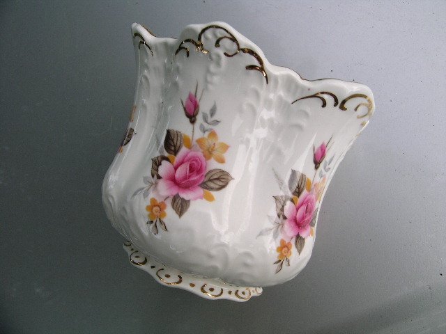 Porcelanowa - z założenia osłonka na doniczkę,ale pojemnikiem kuchennym i łazienkowym - ozdobnym i użytkowym być może :) Dzwięcząca,mocna choć prześwitująca porcelana. Bogate zdobienia wielce ciekawej i niespotykanej formy . Sygnowana St. GEORGE Fine Bone China Made in England. Rant górny falbankowy,złocony.Boki wypukło-wklęsłe,ryflowanym wzorem zdobione,złotem okraszone. Wzór różany w żywych,choć stonowanych barwach. No i jakby nieco spłaszczona - nie okrągła forma.Idealnie leżąca w dwóch kobiecych dłoniaich :)