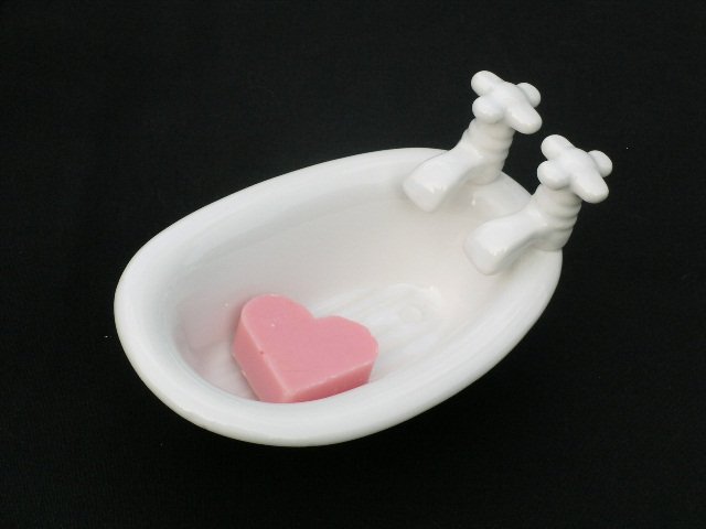 Świetna porcelanowa mydelniczka - fantastyczne wzornictwo, zabawa formą, nawet te kraniki taki po angielsku odwzorowane :) Przyjemna w dotyku, autentycznie łazienkowa. Na błyszcząco szkliwiona, denko lekko fakturowe. Dół 10 x 5; góra 16 x 10; wys. 8 cm. Stan zachowania bardzo dobry.