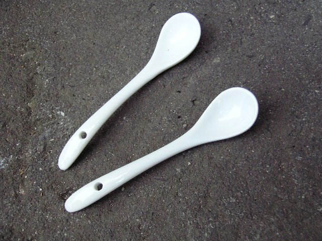 Dwie urocze porcelanowe łyżeczki. Czysta biel. Z dziurką. Praktyczne i dekoracyjne.