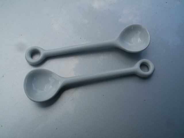 Dwie porcelanowe łyżeczki z dziurką mi dla ozdoby i do powieszenia. Białe, na błyszcząco szkliwione. Idealne do musztardy, chrzanu i domów. Nadają się na prezent. Urocze, użytkowe i ozdobne.
