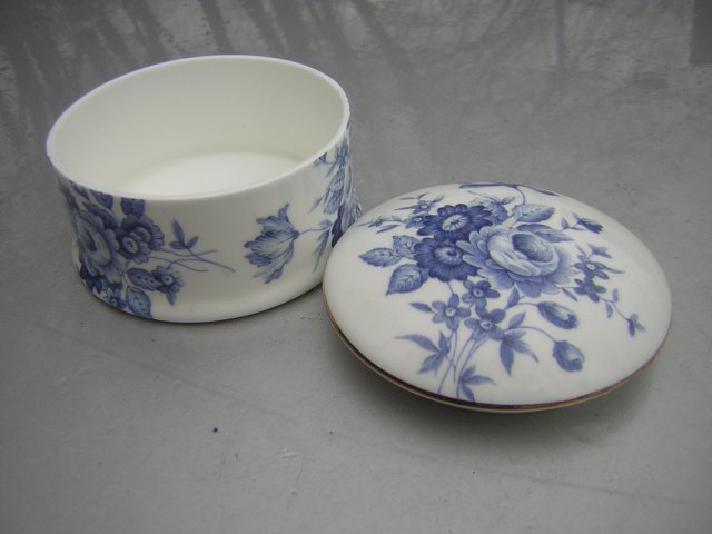 Całkiem spore porcelanowe puzdro. Sygnowane AYSHFORD FINE BONE CHINA MADE IN STAFFORDSHIRE ENGLAND. Klasyczna forma, urocze kwiatowe zdobienie w zniuansowanych niebieskościach. Przykrywka z rantem zabezpieczającym przed spadaniem. Rant przykrywki złocony. Wykończenie satynowe. Idealne na biżury i na ciekawy prezent;) Góra i dół nie całe 8 cm góra podstawy 7,5 wys. Z przykrywką nie pełne 5 cm , bez przykrywki trochę ponad 3 cm