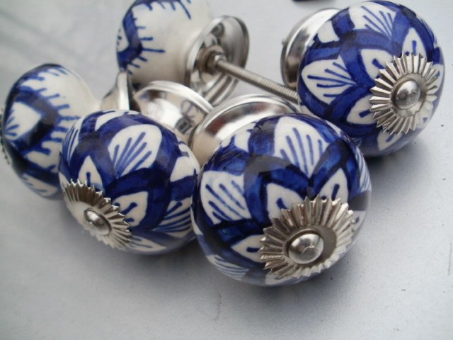 Porcelanowe, ładnie wykonane, ręcznie malowane. Takie same, a jednak każda nieco inna. 6 sztuk Niewiadomego pochodzenia, rękodzielnicze, na błyszcząco szkliwione. Radosne w zniuansowanych kobaltowych niebieskościach. Gwint długi - pasuje do każdej grubości drzwiczek / montując uchwyt jeśli jest zbyt długi można go przyciąć/ srubka mocująca ..Metalowe, srebrne elementy.