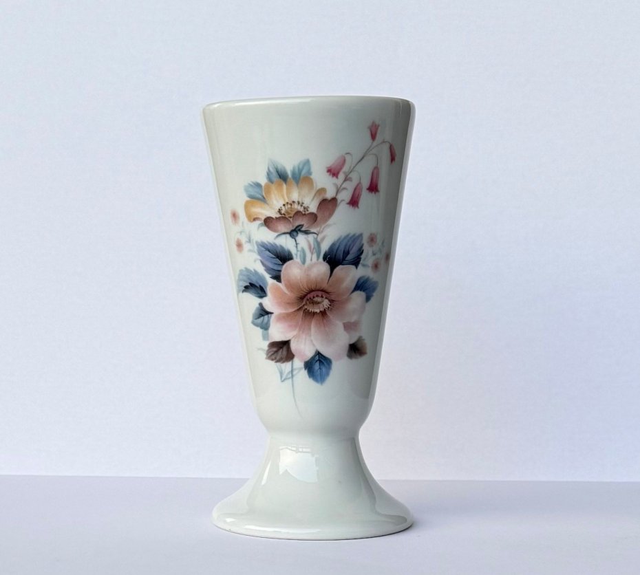 Wyjątkowej urody kielich - mazagran wykonany z wysokiej jakości porcelany. Pochodzący z Limoges, jednej z najbardziej cenionych francuskich wytwórni. To eleganckie naczynie wyróżnia się delikatnym, kwiatowym zdobieniem, które nadaje mu subtelnego, klasycznego uroku.