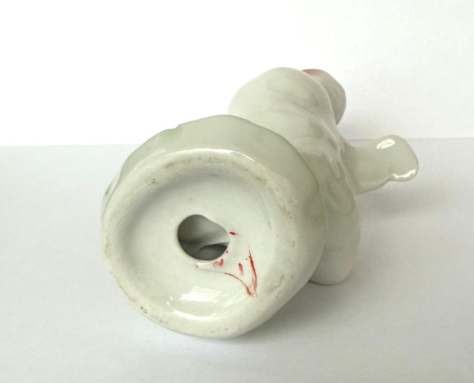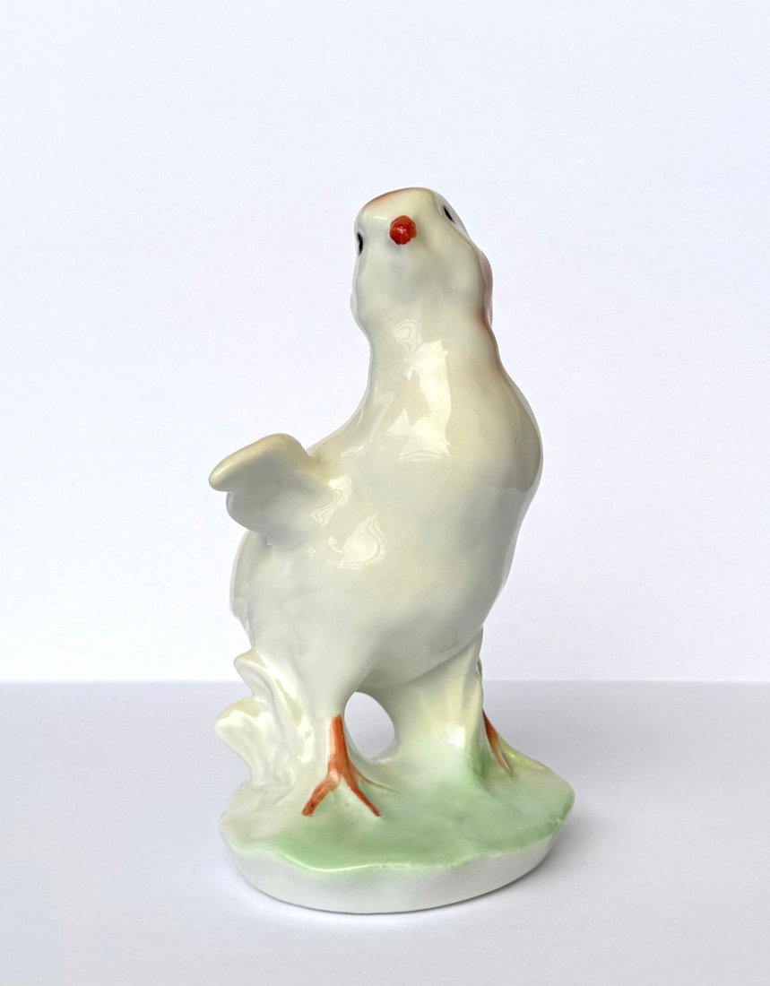 Śliczna figurka, pojedyncze, stojące pisklę, wykonana przez renomowaną rumuńską wytwórnię porcelany Curtea de Argeș. Wyrób ten pochodzi z okresu PRL (lata 70./80. XX wieku) i stanowi klasyczny przykład wzornictwa z tamtej epoki. Figurka charakteryzuje się dynamiczną pozą stojącego ptaszka i wykonana jest z białej porcelany. Dekoracja jest subtelna, naniesiona charakterystyczną dla tego producenta techniką natryskową (airbrush), częściowo ręcznie malowana. Spód figurki posiada oryginalną sygnaturę z oznaczeniem Cal. I, potwierdzającą pierwszą, najwyższą jakość wykonania.